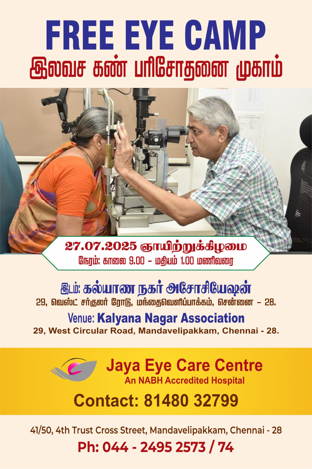 The Jaya Eye Care is going to conduct Free Eye Camp in associate with The Kalyana Nagar Association No.29, T.M.S. Road, Mandavelli Pakkam, Chennai 600 028 at The Kalyana Nagar Association premises Ground Floor on 27.07.2025  (Sunday) from 9.00 A.M to 1.00 P.M. Public can utilize this opportunity.