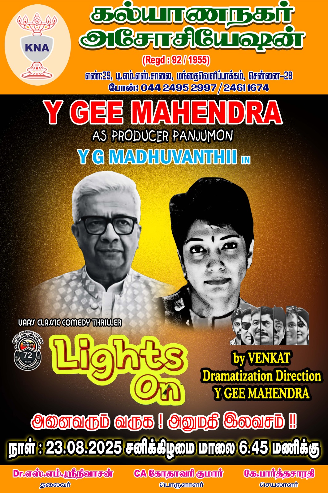 Event Y.G.Mahendran – Drama – Lights On at The Kalyana Nagar Association Premises at 6.45 P.M on 23.08.25 SHARE ON: